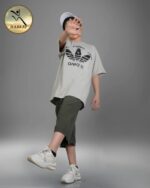 ست تیشرت سوپر پنبه لاکرا و شلوارک کتان سبز، با طراحی خاص و رنگبندی جذاب (کرم، سورمهای، سفید، خاکستری کمرنگ).