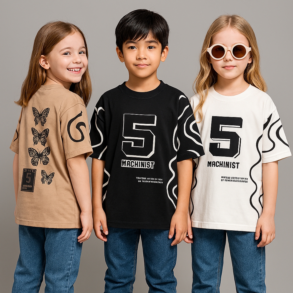 عکس تن پوش بچهها به هوش مصنوعی داده شده که استایل تیشرت در تن بچهها دیده بشه عکس اصلی دو عکس بعدی میباشد.