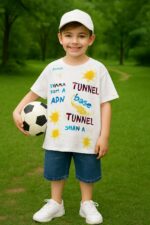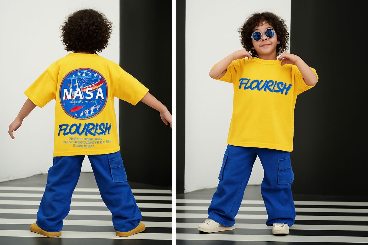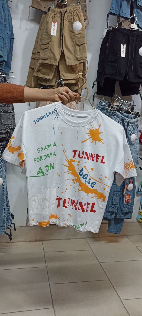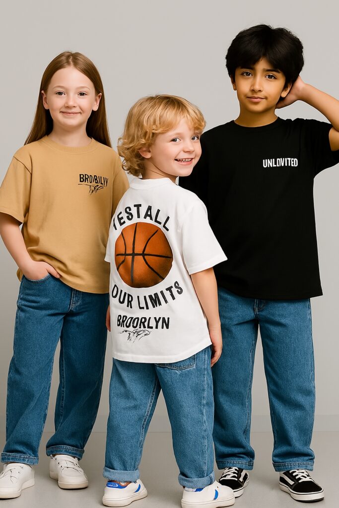 عکس تن پوش بچهها به هوش مصنوعی داده شده که استایل تیشرت در تن بچهها دیده بشه عکس اصلی دو عکس بعدی میباشد.